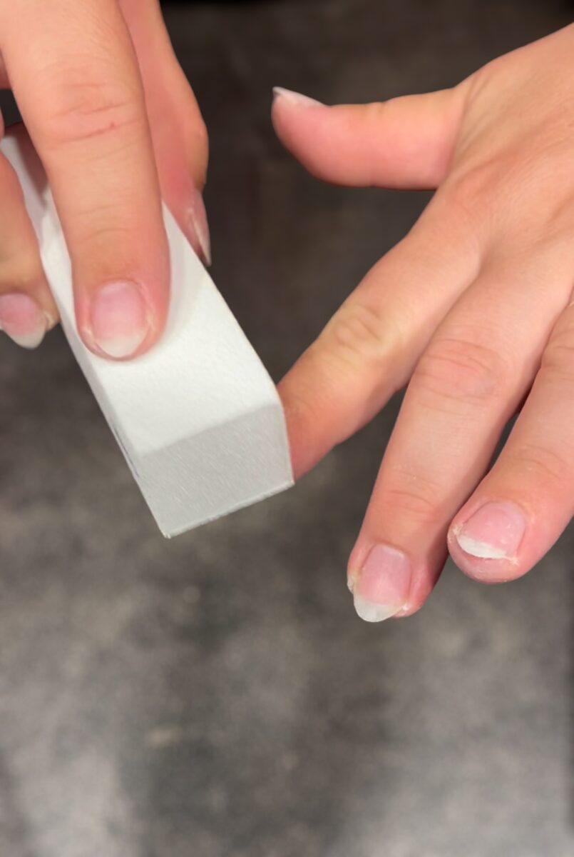 3. Unebenheiten entfernen: entferne auch alle weiteren Unebenheiten auf dem Nagel und (wenn nötig) arbeite mit einem Buffer. So ist dein Nagel schön eben und ist optimal auf die UV-Folien vorbereitet.